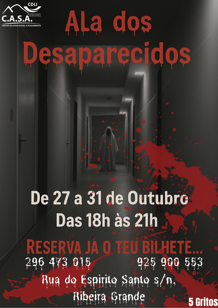 Entre os dias 27 e 31 de outubro de 2025, das 18h00 às 21h00, o espaço do CDIJ transforma-se na enigmática “Ala dos Desaparecidos”, um percurso imersivo repleto de suspense, mistério e emoção, onde cada detalhe foi preparado com rigor e criatividade pela equipa técnica e pelos jovens participantes.